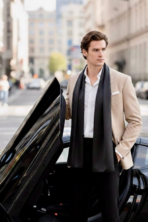 Schlicht, aber eindrucksvoll: Der Seidenschal bringt deinen Anzug auf das nächste Level und unterstreicht deinen Sinn für Stil ohne Worte.